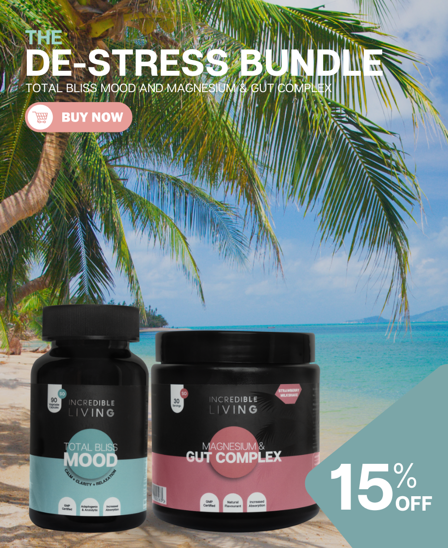 Introducing the Incredible De-Stress Bundle by Incredible Living—a powerful combination of our Magnesium & Gut Complex and Total Bliss (Mood) products designed to harmonize your digestive health and uplift your mood for a comprehensive approach to stress relief and overall wellness, ideally taken at night.